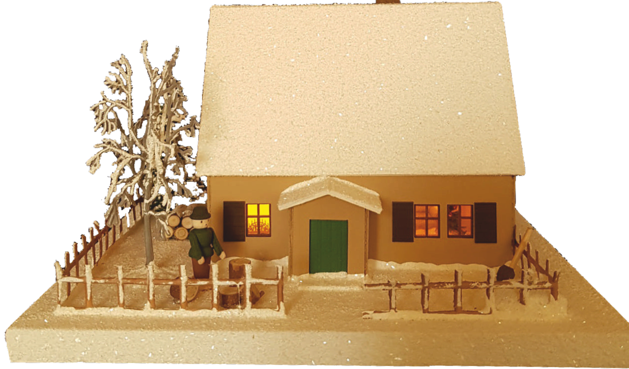 Die Bodenplatte ist aus Holz und ca. 18,5x17cm groß. Das Erzgebirgshaus ist ca. 11cm hoch und wird komplett mit elektrischer Beleuchtung geliefert.