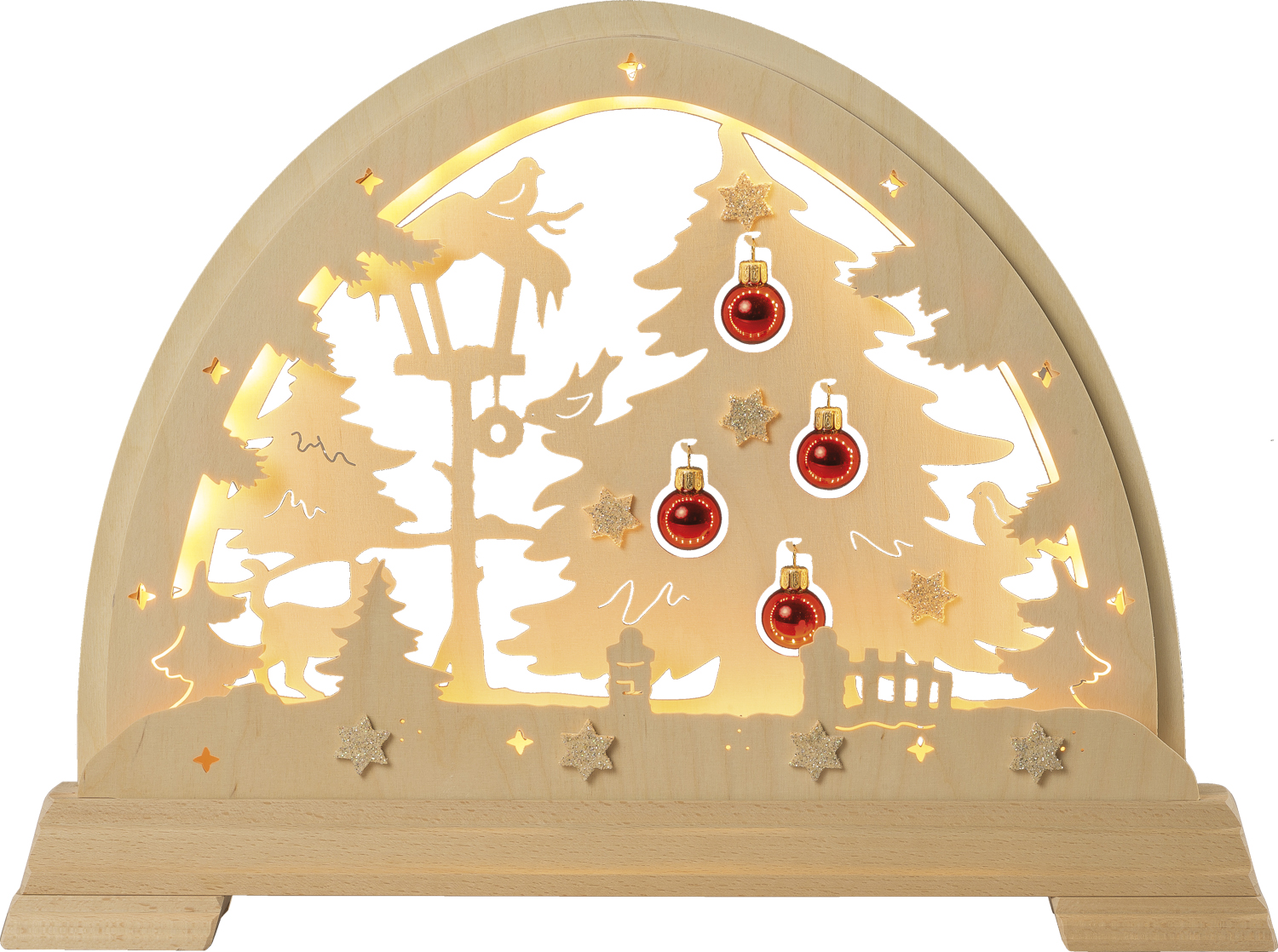 Beleuchten Sie Ihre Fenster mit einem gotischen Lichterbogen aus dem Erzgebirge. Die Katze hält Ausschau nach den Vögeln im Vogelhaus und im Weihnachtsbaum hängen 4 rote Glaskugeln.